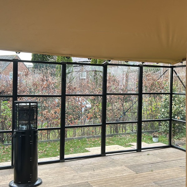 De vaste plexiglas wand is een slimme keuze wanneer u uw gasten extra comfort wilt bieden. Door het transparante materiaal blijft de ruimte licht en open, terwijl het zwarte frame zorgt voor een moderne en verzorgde uitstraling. Zo blijft uw evenement sfeervol, ook wanneer het weer minder gunstig is.